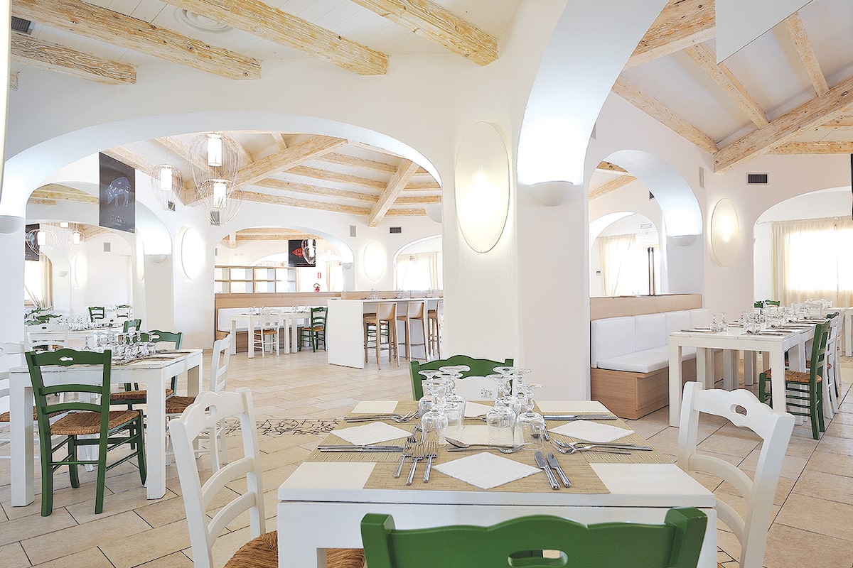 luminoso e accogliente con aria condizionata e con possibilità di mangiare nel porticato esterno. Ricco buffet a colazione, pranzo e cena, pizza, specialità di mare e terra, una portata vegetariana sempre garantita, soft drinks, acqua e vino della casa.